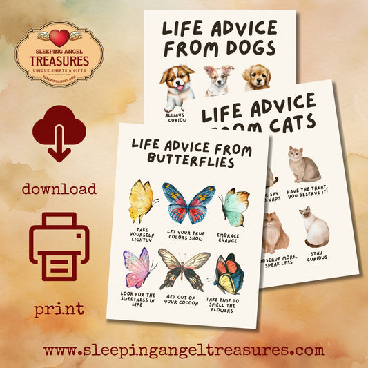 Printable Life Advice from Dogs, Cats, Butterflies Poster Pack - DIGITAL DOWNLOAD