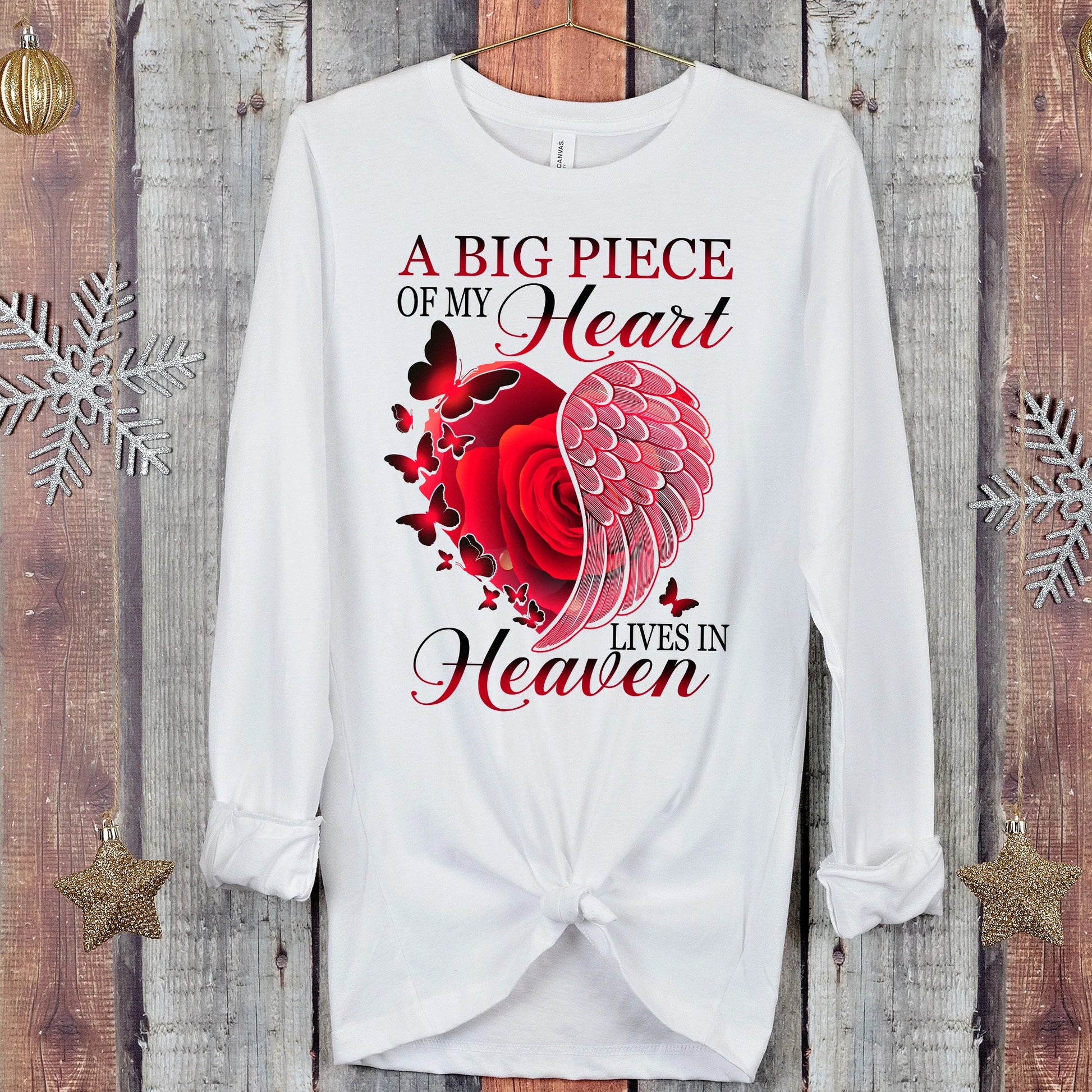 Honor and remember a loved one with this heartfelt long sleeve tee, featuring “A big piece of my heart lives in heaven” with butterflies and angel wings. Perfect for grieving moms, memorial gatherings, or as a comforting condolence gift, this shirt helps express love, remembrance, and support for those navigating loss.