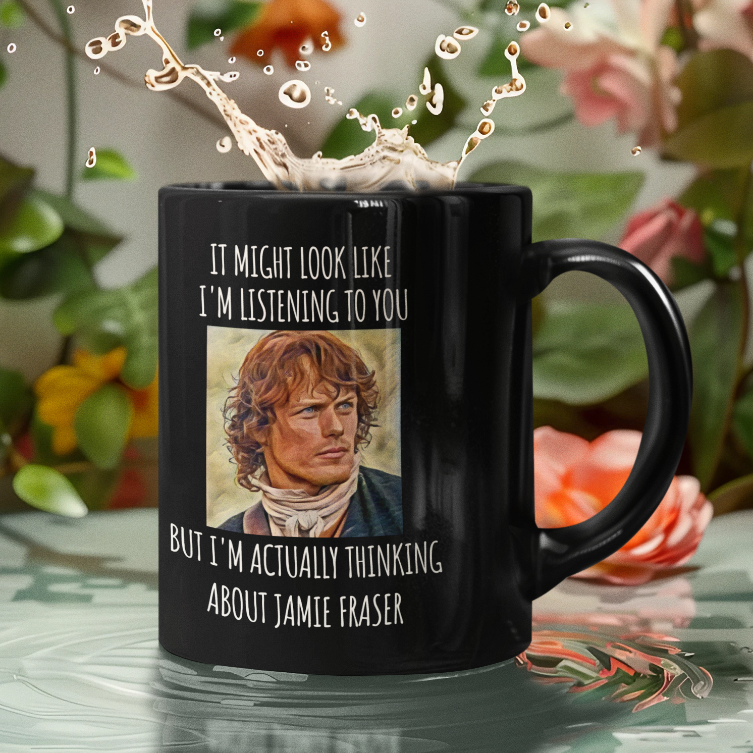 Embrace your love for Outlander with our "It May Look Like I Am Listening to You But I Am Really Thinking About Jamie Fraser" Black Glossy Mug. This funny Outlander Cup is perfect for fans who adore Jamie and Claire Fraser, offering a fun nod to the beloved characters created by Diana Gabaldon. Show your pride in the Fraser Ridge clan with this unique Outlander Mug that captures your passions perfectly!