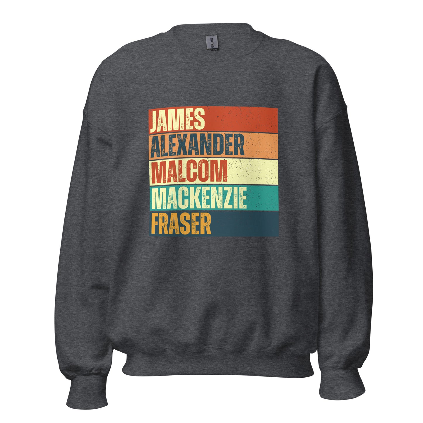 Embrace your love for Outlander with our "James Alexander Malcom MacKenzie Fraser" sweatshirt. This cozy Outlander sweatshirt is perfect for fans who adore Jamie Fraser, offering a fun nod to the beloved character created by Diana Gabaldon. Made from soft, high-quality fabric, this Outlander merch is not only comfortable but also stylish, making it an ideal gift for her or a great addition to your wardrobe. Whether you're lounging at home or out and about, this Sassenach shirt will surely spark conversations among fellow fans. Show your pride in the Fraser Ridge clan with this unique Outlander sweater that captures your passions perfectly!