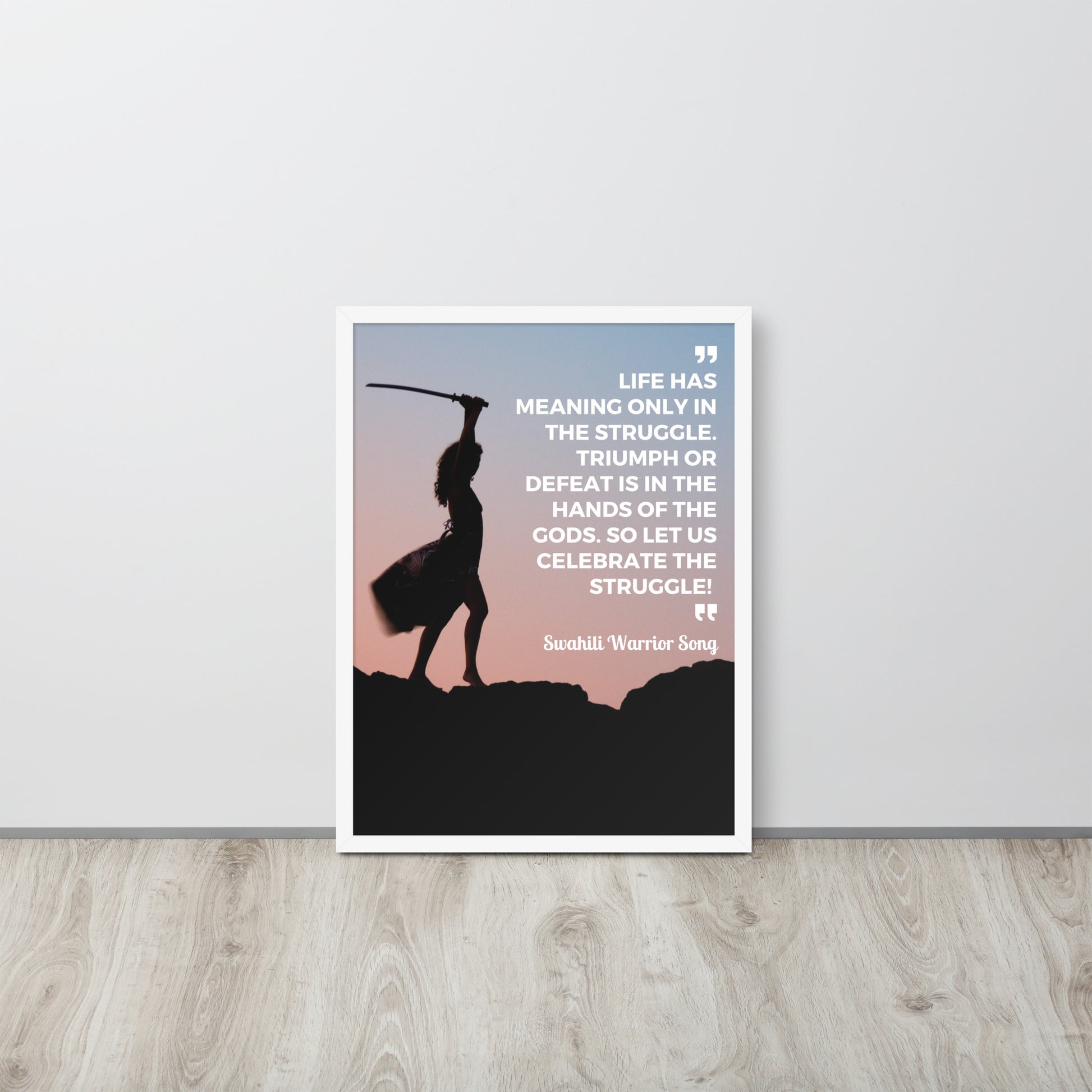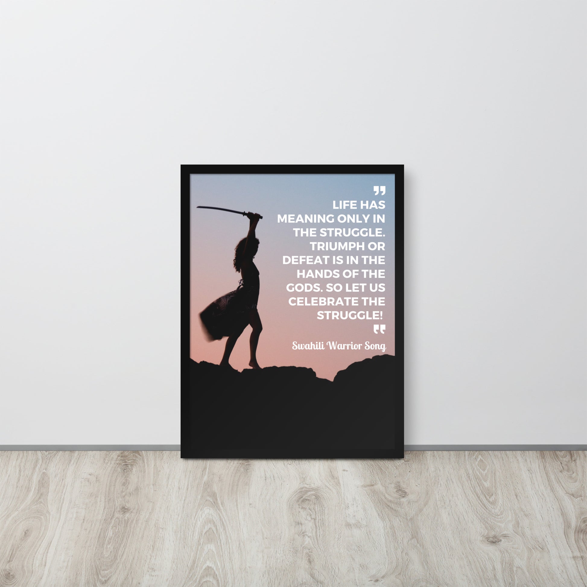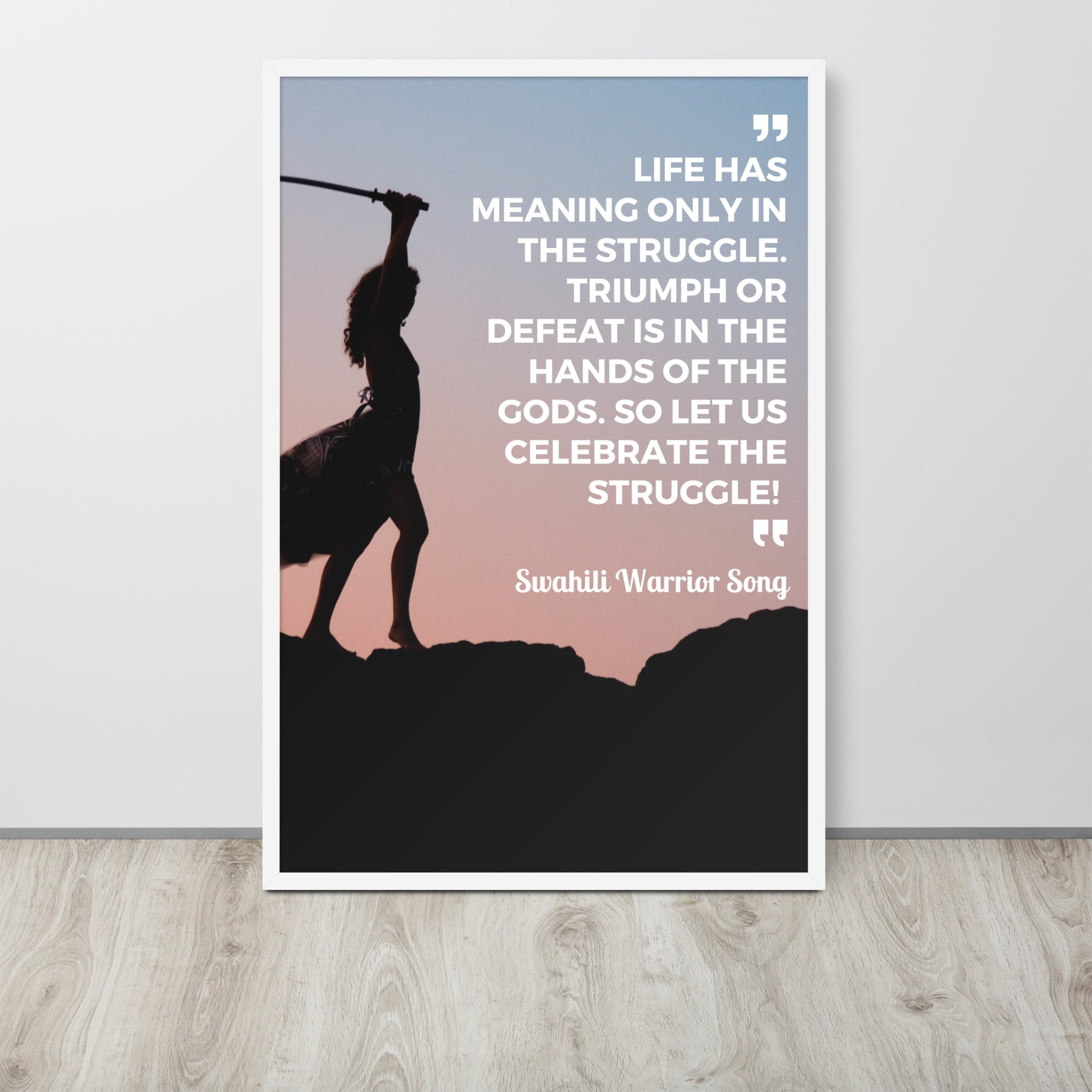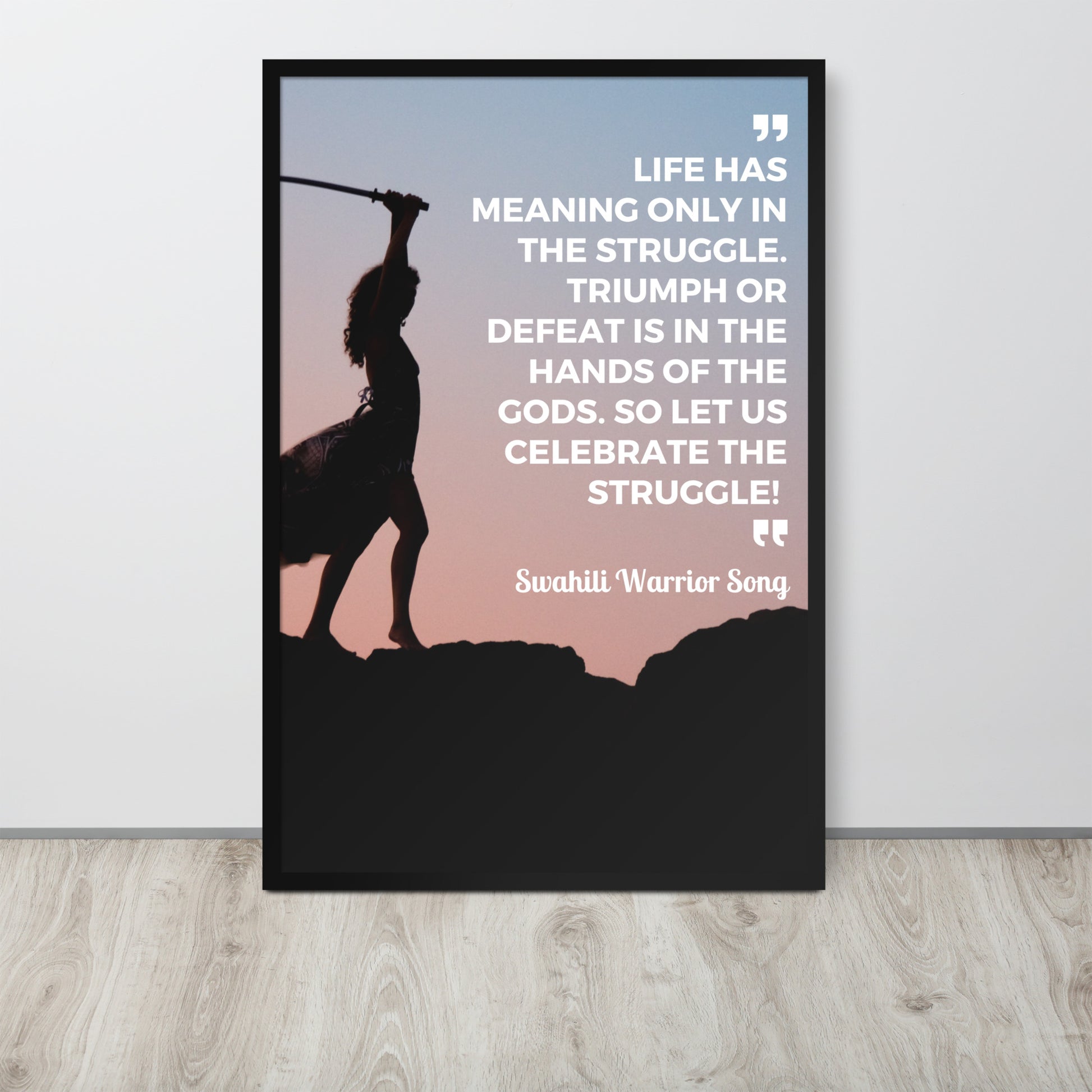 Transform your space with our inspirational FRAMED poster that beautifully captures the essence of perseverance and triumph. Featuring the uplifting message “Life has meaning only in the struggle. Triumph or defeat is in the hands of the gods. So let us celebrate the struggle,” this motivational quote draws inspiration from the Swahili warrior song, reminding us that every challenge is an opportunity for growth. Perfect for any room, this wall art serves as a daily motivation print, ideal for office wall decor or home office decor. Hang this inspirational print where you can see it every day and let it be a source of positive affirmation, encouraging you to embrace the journey of life. Make this struggle quote a part of your decor and inspire yourself and those around you with its powerful message!